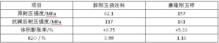 由表1可以看出,要獲得相同的作業性,粗顆粒、中顆粒、細粉質量比為58:22:20的5 #配料用水量較少,各項物理指標也較好。也即增加顆粒的加入量可以提高澆注料的密度。 2.2 α-AL2O3微粉種類選擇和加入量 以5#配比為基礎,試驗選用編號為y、s、z、b、j、c的六種α-AL2O3,微粉做對比試驗,這六種α-AL2O3微粉的粒徑分布和比表面積各不相同。采用的六種微粉盡管粒徑分布不同,比表面積各異,但配制的澆注料的物理性能都能滿足預期要求。相比之下,含微粉 c的配料用水量更小些(3.3%),各項物理指標也較好些。當選用α-AL2O3微粉c,加入量為3%~6%時,配料用水量相同,并且試樣的物理指標也在目標值內。 2.3 uf-si02,種類選擇和加入量 本試驗選用國產微粉和埃肯微粉做對比試驗,國產uf-siO2配料用水量3.5%,?蟯f-Si02配料用水量3.3%。澆注料的物理性能見表2。可以看出,要達到相近的流動性,用國產uf-si02時,施工用水量多于用?蟯f-SiO2的用水量,試驗的各項物理指標都不如用進口微粉的試樣。更為嚴重的是,因為國產微粉雜質含量高,1 500℃燒后試樣發生鼓脹變形,而加進口微粉的試樣1500℃燒后試樣外觀規整。為了制得質量優良的預制塊,決定采用?系膗f—Si02。 試驗選用埃肯微粉的加入量為3%、4%、5%、6%、7%做對比試驗,試驗結果列于表3。由表3可以看出,當uf—Si02加入量為3%一4%時,施工用水量較大,燒后線變化也較大,當加入量為5%~7%時,施工用水量較小,各項指標也在目標值內。 2.4水泥種類和加入量 剛玉預制塊由于位于陶瓷杯中心和風口部位,為保證其良好的高溫性能,由配料引入的ca0必須小于0.5%,所以該澆注料應為性能優良的超低水泥澆注料。試驗選用CA一75G和Seacar71兩種純鋁酸鈣水泥做對比試驗,加入量在0.5%~1.5%。結果發現,兩種水泥當加人量為O.5%~1.5%時,各項物理指標都能滿足要求。但前者雜質略高于后者,后者性能較為穩定,故決定采用seacar71水泥。 2.5配比確定 選用粗顆粒、中顆粒、細粉質量比為58:22:20,其中α-AL2O3,微粉加入量為6%,uf-Si02加人量為6%,seacar71水泥加入量為l%制備了棕剛玉澆注料。 棕剛玉澆注料的抗渣結果為:切開坩堝,無明顯的浸蝕滲透現象。 從抗堿試驗來看,剛玉莫來石樣完全潰散,無一完整的。賽隆剛玉樣與棕剛玉澆注料試樣完整無裂紋,其抗堿性試驗結果見表4。棕剛玉澆注料有較好的抗堿性能,但與賽隆剛玉樣相比,抗渣試驗后體積膨脹較大,吸收的K2O也較多。