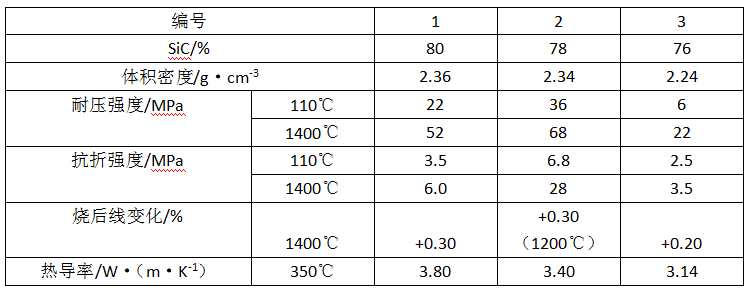 表1-1為高熱導率耐火澆注料的性能。SiC骨料的顆粒級配為5-3mm,11%;3~1mm,49%;1~0.15mm,40%;耐火粉料為SiC微粉,其細度為0.043mm(325目)。采用鋁酸鹽水泥作結合劑,并摻加減水劑、早強劑和膨脹劑等復合外加劑。耐火骨料和粉料之質量比為70:30。