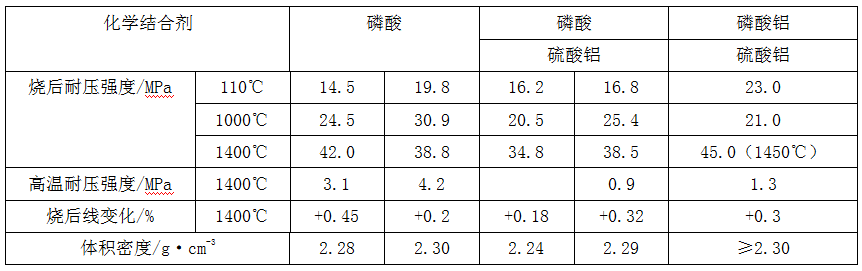 磷酸類硅酸鋁質(zhì)耐火可塑料的主要性能,見表1-1。從表中看出,烘干耐壓強度較高,1400℃燒后耐壓強度為35~42MPa。1400℃高溫抗折強度約為1.0MPa。另外,1350℃高溫抗折強度為2.1~3.3MPa。這說明,因含軟質(zhì)黏土,高溫下液相量多,致使高溫強度較低。