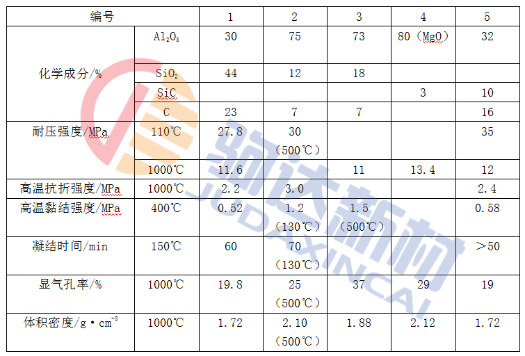 表1-2為大中型高爐耐火壓入料的性能。編號(hào)4為活底煉鋼轉(zhuǎn)爐用耐火接縫料,也可用于其爐帽周圍襯體的噴補(bǔ)。其余編號(hào)的耐火壓入料,一般為高鋁質(zhì)或莫來石質(zhì)的,用樹脂作結(jié)合劑,在高爐上使用,已初見成效。