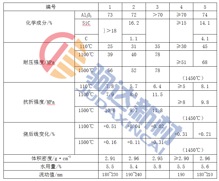 表1-1 出鐵溝用自流耐火澆注料的性能