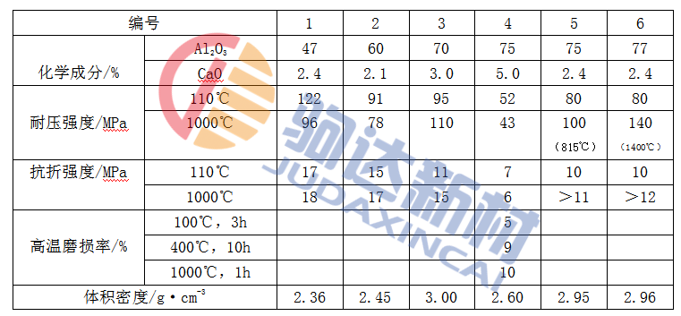 耐磨耐火澆注料用的耐火骨料,應致密堅硬,用多級顆粒級配,達到最大的堆積密度;耐火粉料細度為0.09mm的應大于90%。選擇優(yōu)良的結(jié)合劑、超微粉和外加劑,使?jié)沧⒘线_到致密、高強。因此,該類料具有很高的強度和良好的耐磨性。表1-1為耐磨耐火澆注料的性能。表中編號6含Cr2O3 3%左右,成型體經(jīng)1420~1480℃燒成,用于軋鋼加熱爐滑軌和平臺,使用效果較好。如經(jīng)600℃烘烤,應加強基質(zhì)配料,保證在1200℃時能夠燒結(jié),即能達到足夠高的高強,提高制品的耐磨性。