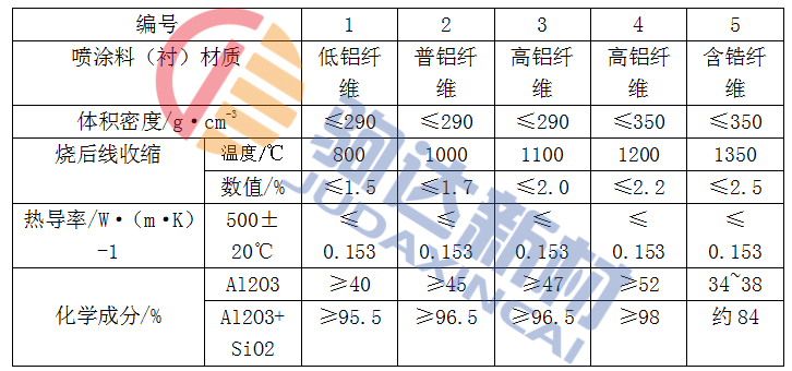 耐火纖維噴涂料(襯)是用專門噴涂機將預(yù)處理好的纖維高壓送至噴槍、同時用膠泵將結(jié)合劑送至噴槍外環(huán)縫隙內(nèi),纖維和結(jié)合劑邊噴出槍口邊混成一體噴射到受噴面上,便形成噴涂層。然后,用便攜式針刺機進行二次絞織處理,使其成為三維網(wǎng)絡(luò)結(jié)構(gòu),以提高襯體縱向抗拉強度,延長使用壽命。表1-1為耐火纖維噴涂料(襯)的性能。