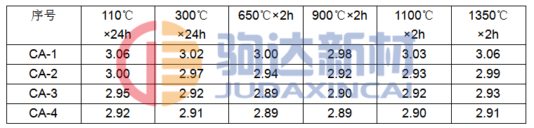 將CA料加水攪拌,在40mm×40mm×160mm的模具中成型,自然養護24h脫模,分別測110℃×24h烘后、300℃×24h烘后、650℃×2h燒后、900℃×2h燒后、1100℃×24h燒后和1350℃×2h燒后的強度、體積密度和失重率,試驗結果見表3和圖1。