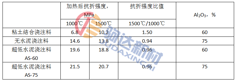 觀察澆注體的組織結(jié)構(gòu)均勻性,可通過(guò)材料分別收到中溫、高溫加熱處理后的抗折強(qiáng)度比值進(jìn)行分析,若是強(qiáng)度比值較小時(shí),可認(rèn)定為組織結(jié)構(gòu)是均勻一致,使用中燒結(jié)反應(yīng)層與燒結(jié)反應(yīng)過(guò)渡層之間不容易出現(xiàn)分開(kāi)剝落。舉幾例材料加以說(shuō)明,如表2所示。