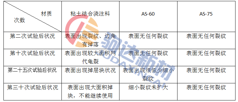 在一般情況下,強度較高的材料脆性較大,耐熱震穩(wěn)定的性能相對差些。當溫度變化頻繁時易出現分層剝落現象。而我們研究開發(fā)出的纖維增強AS-60、AS-75這兩種無水泥和超低水泥澆注料因原料選擇、物料配合比參數合理,使施工體組織結構較均勻,抗剝落性較好。經數次急冷急熱的材料對比試驗(對比結果如表3)和在軋鋼650加熱爐口、突出帶和燒嘴磚等處對比應用,均取得較好的效果。