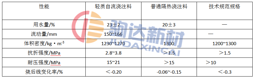 經試驗,自流澆注料的基本配方(%)為:礬土水泥30~35,陶粒45~55,超細粉15〜 20,硅灰1.5 ~2.0,以及適量的分散劑,澆注料性能見表2。