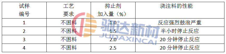 高鋁磷酸鹽澆注料采用不困料。添加抑止劑是項施工新工藝,但關(guān)鍵是控制好抑止劑的加入量。我們以高鋁礬土為原料(Fe2O3<1.5%),以江蘇武進(jìn)生產(chǎn)的PA-80膠作結(jié)合劑,反復(fù)實驗抑止劑適宜的加入量為2~2.5%,試驗情況見表4。