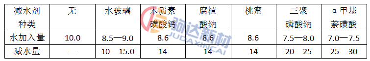 試驗方法:將一定組成的配料分別置于幾個燒杯中,每個燒杯中分別加入不同的減水劑(占配料量的0.3%);水玻璃、木質(zhì)素磺酸鈣、糖蜜、三聚磷酸鈉及α甲基萘磺酸等,并混勻。再逐一以滴定管加水于燒杯中,邊滴邊攪拌,直到開始流動,進而較易流動。記下加水量,就得到不加和加入減水劑的加入量(見表2)。