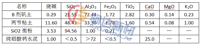 為了提高材料的抗震穩(wěn)定性,并考慮到加熱爐的最高使用溫度較高(超過1100℃),選用了B級礬土熟料作為主要原料,為了提高澆注料的結(jié)核性、干燥性和燒結(jié)性,引入了少量的粘土;為確保CaO的含量小于1.5%。選用純鋁酸鈣水泥作結(jié)合劑;為了提高澆注料的流動性,配料中添加了SiO2微粉,因其較大的表面積及表面能,還有利于增強凝聚作用,從而提高預(yù)制塊的強度。各原料的化學(xué)成分列于表1。