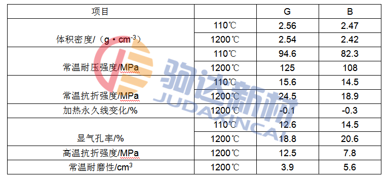 表5 以兩種礬土為骨料制備的高鋁澆注料的性能