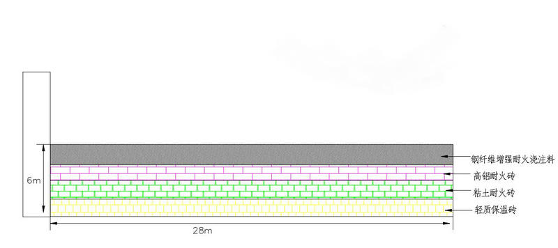 在對(duì)臺(tái)車(chē)面所砌筑的耐火磚進(jìn)行改進(jìn)的同時(shí)需要考慮的首要問(wèn)題就是所使用耐火材料的耐火性能即材料的荷重軟化溫度要高于正常加熱爐使用溫度的100~150℃,然后其考慮材料的耐磨性能和整體性能,在受到大型鑄件放上去以后臺(tái)車(chē)在推進(jìn)的同時(shí)所產(chǎn)生的重力對(duì)耐火材料不能產(chǎn)生破壞的應(yīng)力。只有保持完整的整體性和耐磨性才能保證對(duì)鑄件上脫落下來(lái)的氧化鐵皮的抗侵蝕性能。我公司在經(jīng)過(guò)一系列研究后選用了鋼纖維增強(qiáng)澆注料對(duì)臺(tái)面的耐火材料進(jìn)行一次性澆注的方案。鋼纖維增強(qiáng)澆注料采用的剛玉級(jí)別的耐火骨料其致密度要大于之前所使用的耐火磚,為了防止使用剛玉為骨料配制的耐火澆注料高溫下容易發(fā)生的脆性,,在其里面添加相當(dāng)量的鋼纖維作為曾韌的效果。以下是我公司鄭州駒達(dá)新材料科技有限公司所設(shè)計(jì)的新型臺(tái)車(chē)面第一層為輕質(zhì)保溫磚砌筑、第二層為粘土耐火磚、第三層為高鋁耐火磚,最后用鋼纖維增強(qiáng)澆注料一次完成整體澆筑,促使臺(tái)車(chē)面整體結(jié)構(gòu)一致的效果。