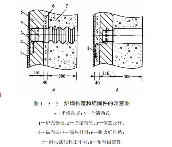 圖中a和b型的不同,還有錨固磚、連接件的長(zhǎng)短有差異。鋼筋拉桿用的固定件分別為厚壁鋼管和角鋼,必須與爐殼鋼板焊接牢固。錨固磚的長(zhǎng)度應(yīng)滿足其冷端砌筑或澆注在隔熱層中,以滿足施工的要求。錨固磚用鋼筋拉桿與爐殼連接,且為活動(dòng)式的,錨固磚端面與爐 殼間距應(yīng)≥40mm,這樣能隨著爐墻的漲落而上下移動(dòng),也能隨著爐墻的脹縮而左右移動(dòng)保證了爐墻的穩(wěn)定和長(zhǎng)壽。
