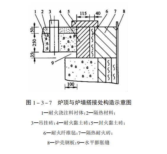 應(yīng)當(dāng)指出,用不定形耐火材料筑爐,其爐頂一般采用平頂為宜,這樣有利于設(shè)計(jì)和施工,也不影響使用;若設(shè)計(jì)新爐型,形狀無論如何復(fù)雜,均可用不定形耐火材料制作。為了提高爐頂?shù)氖褂脡勖ㄟ^錨固吊掛系統(tǒng),使?fàn)t頂處于自由狀態(tài),即與爐墻分開,其構(gòu)造處理見圖3,使用證明是行之有效的。耐火黏土磚與爐墻耐火澆注料襯體之間,必須干砌,便于移動(dòng);圖中6和9是預(yù)留的膨脹縫,允許用耐火纖維氈、毯填充。當(dāng)爐頂上、下漲落時(shí),有水平膨脹縫緩沖。該縫大小與爐墻高度、爐頂下降程度和使用溫度等因素有關(guān),原則是在任何情況下,爐頂不能與爐墻上表面和側(cè)表面接觸;當(dāng)爐頂產(chǎn)生側(cè)推力時(shí),將推動(dòng)磚墻,到側(cè)膨脹縫處得到緩沖,該縫大小由爐頂?shù)膫?cè)推力決定。另外,爐頂四周的吊掛磚應(yīng)離開爐墻的上表面,即其中心線與爐墻工作面之間的距離,一般應(yīng)大于200mm。
