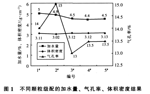 原料是以棕剛玉為骨料,碳化硅、水泥、uf-SiO2、α-Al2O3 為基質(zhì),試驗(yàn)用澆注料的骨料采用≤1mm、1 ~3mm、3~5mm 三級(jí)粒度。骨料和粉料的質(zhì)量比為 63~70∶37~30。澆注料的致密程度和流動(dòng)性跟顆粒級(jí)配密切相關(guān),而最佳的顆粒級(jí)配又隨骨料種類、臨界粒度的大小和基質(zhì)組成的不同而不同,最合適的顆粒級(jí)配應(yīng)該由試驗(yàn)確定。本試驗(yàn)選擇5種不同的顆粒級(jí)配,細(xì)粉部分全部相同,顆粒級(jí)配的試驗(yàn)配方如表2所示。這5個(gè)配方的試驗(yàn)結(jié)果示于圖1。