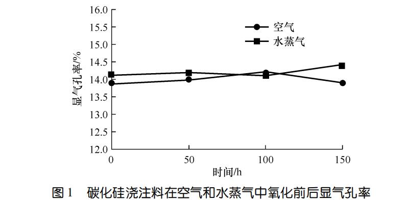 圖1示出了碳化硅澆注料在空氣和水蒸氣氧化前后的顯氣孔率?梢钥闯,無論是空氣還是水蒸氣氧化,顯氣孔率均變化不大。氧化150h試樣與氧化前相比,水蒸氣條件下的顯氣孔率略有增大;空氣條件下的顯氣孔率略有減小。可能與水蒸氣條件下試樣結構遭到較大破壞有關。一般情況下,碳化硅氧化會因氧化產物SiO2等堵塞氣孔導致氣孔率在氧化初期下降明顯,后期逐漸趨于平穩,但對于碳化硅澆注料卻沒有出現早期顯氣孔率下降的情況?赡
