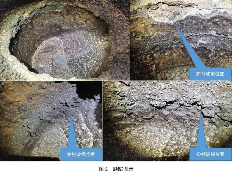 在鐵水包內(nèi)進行孕育處理時,鐵水運動劇烈,加重了襯體的侵蝕。采用鑄造用除渣劑對鐵水表面的熔渣進行聚集和粘結(jié),在除渣過程中熔渣會變粘,易掛在襯體壁上,難以清理。加上攪動鐵水的沖刷,以及間歇式作業(yè)所造成的溫度波動,在鐵水包內(nèi)襯,特別是渣線部位耐火澆注料的損毀加劇,如圖2所示。