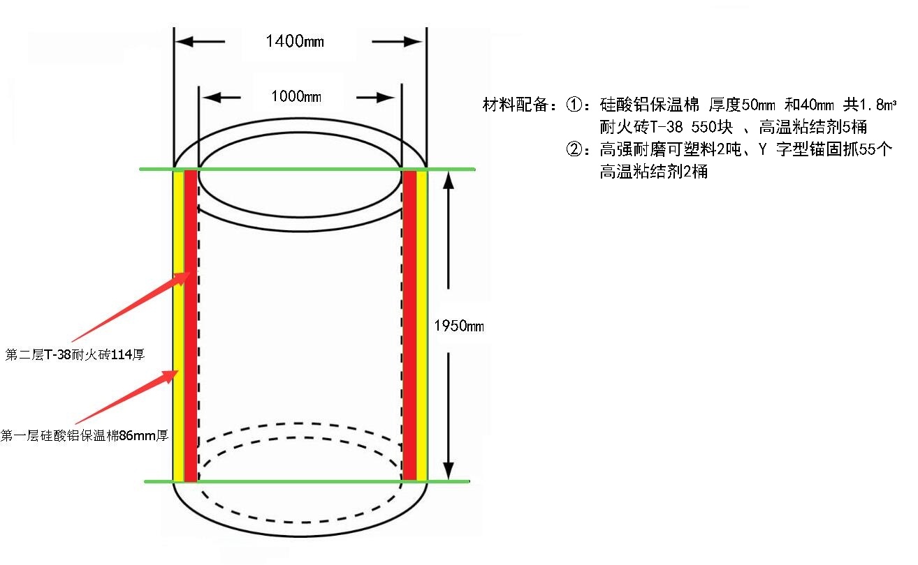 焙燒爐催化劑干燥裝置圖紙,外形為圓筒形狀,其中爐體外徑直徑(不包括管件伸出長度,只包括可利用直徑)為1400mm ,高度到從下底到上口可利用長度為1950mm(不包含爐蓋地方),工況要求:爐內(nèi)最高溫度450°C,傳導(dǎo)外壁溫度降至50-60°C,爐內(nèi)耐火材料層砌筑后剩余空間內(nèi)徑是1000mm。我公司根據(jù)上述工況要求和圖紙所標(biāo)注的材料并結(jié)合我公司的經(jīng)驗(yàn)給予貴司以下2中方法砌筑方案: